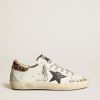 Et tidløst ikon endnu et, der konstant udvikler sig. Hos Golden elsker vi at tage vores klassikere og omarbejde dem hele tiden, altid fra en ny vinkel. Disse superstjerne med en hvid læder øvre har en bordeaux glitter-stjerne, sølv lamineret læderhælfane og duede-grå ruskindindsatser, såsom tungen og indsatsen på bagsiden. Og de beige og brune leopard-tryk snørebånd tilføjer sidste touch.
