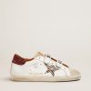 Et tidløst ikon endnu et, der konstant udvikler sig. Hos Golden elsker vi at tage vores klassikere og omarbejde dem hele tiden, altid fra en ny vinkel. Denne model med hvid læder øvre har en krystalstjerne i beige og brun leopardprint og en sølvfarvet krystalhælfane. Dove-grå ruskindtunge og brune snørebånd med kontrasterende hvidt logo tilføjer sidste hånd.