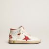 Et tidløst ikon endnu et, der konstant udvikler sig. Hos Golden elsker vi at tage vores klassikere og omarbejde dem hele tiden, altid fra en ny vinkel. Denne unge model med hvid læder øvre har en isgrå ruskindstjerne og rødt metallisk læderhælfane. Den kontrastfulde sorte gyldne gåsebogstaver, smiley -detaljer om rævning og hvide snørebånd tilføjer sidste touch.