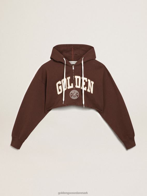 Golden Goose Danmark P0J62989 kvinder | Golden Goose Walnut-Brown Journey Collection Hooded beskåret sweatshirt med kontrasterende hvid gyldne bogstaver